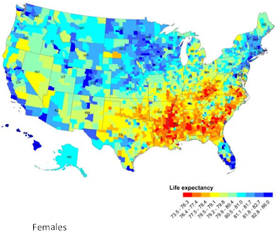 Brown explains, "Life expectancy is an abstract concept that summarizes the health and threats to longevity that exist at a particular moment in history. It is not an actual measure of how long people are living." For a further explanation of that, and the rest of the story, click here. For the press release about the study, go here; for the full study, which includes larger versions of the maps below, from Population Health Metrics, here.