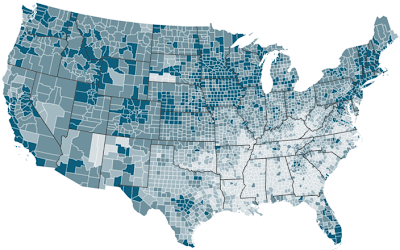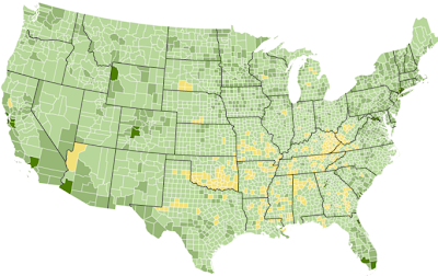On the heels of the health data we posted about last week comes a study showing life expectancy declining for much of Appalachia (among other rural areas). While the average life expectancy for America as a whole increased between 1987-2007 (from 73.7 to 75.6 years for men, and from 79.6 to 80.8 years for women), rural areas are not faring nearly as well. As this interactive map shows, nearly all of Appalachian Kentucky has seen a decline in life expectancy, along with southern West Virginia, far southwest Virginia and southeastern Ohio. Women in particular face the most decline: in Owsley County, KY, life expectancy for women dropped 1.1% (to 76.1 years, more than four years below the national average), while for men it stayed the same – though considering they die 7.4 years earlier than the average American man, that's still nothing to crow about.