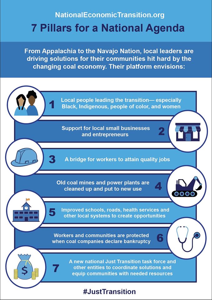 Over the past year, the Mountain Association worked with 17 public, private and nonprofit partners from throughout Appalachia and across the country to develop a platform of seven pillars that policy makers and leaders should understand in order to support our communities. The National Economic Transition (NET) platform is based on community-driven solutions, crafted by local, tribal and labor leaders living and working in America’s coal communities. It serves as a guide for legislators and philanthropic leaders, and encourages them to develop policies and make investments that support the just and equitable national transition our communities need and deserve.